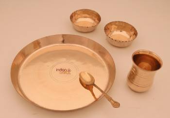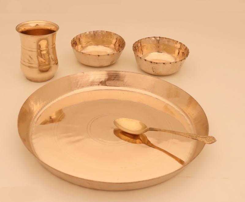 Number of Pieces: A typical Kansa Thali set include 1Thali (plates), 2 Katoris (bowls), and 1 glasses, and 1 Spoon