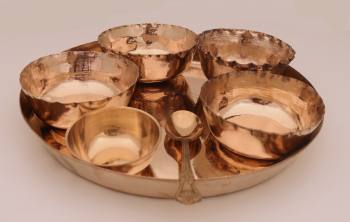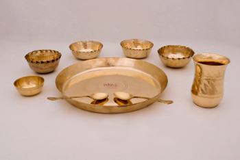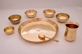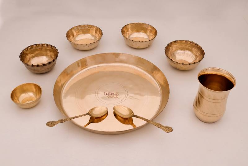 Number of Pieces: A typical Kansa Thali set include 1Thali (plates), 5 Katoris (bowls), and 1 glasses, and 1 Spoon