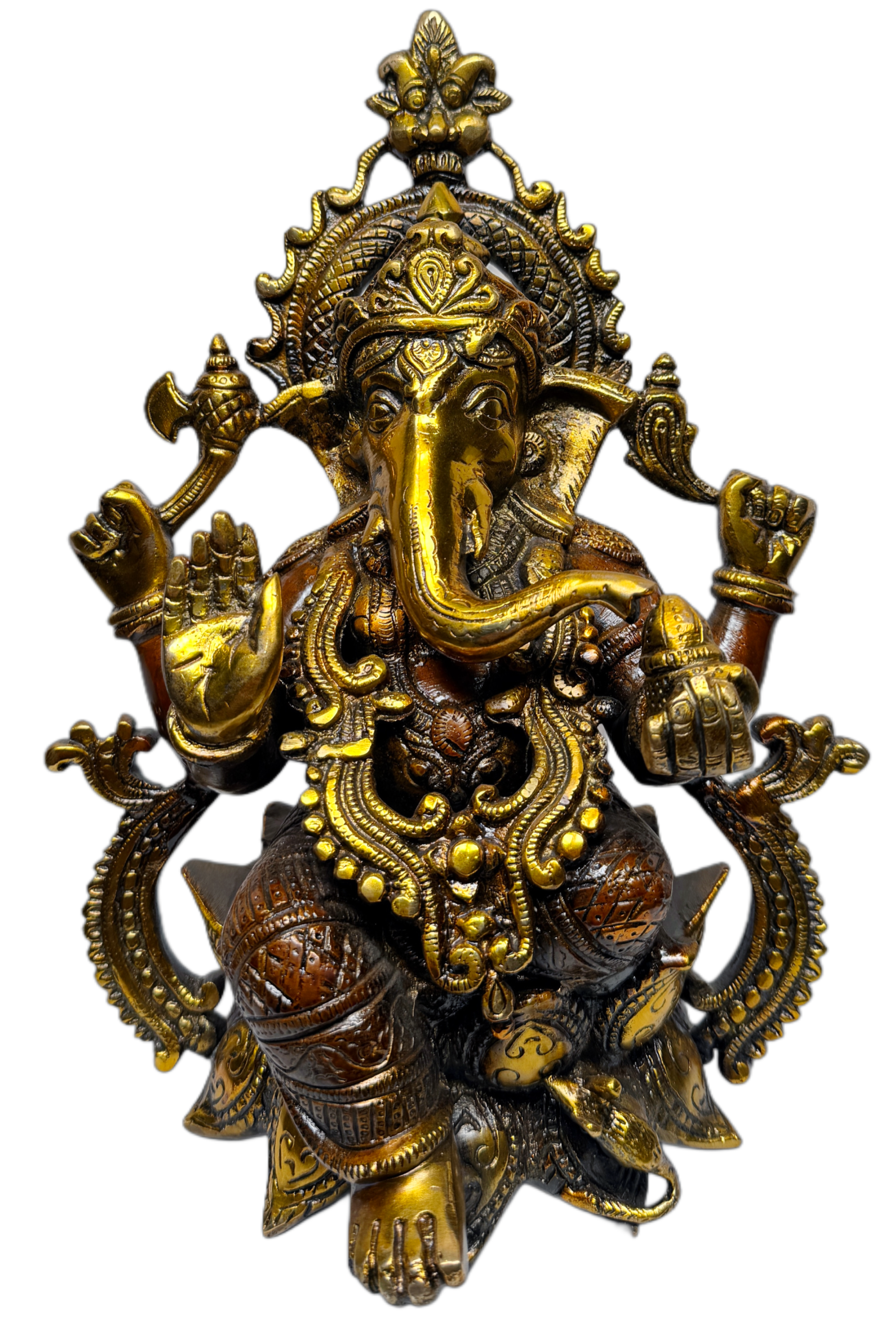 Finished in a rich antique gold and copper tone, this Ganesh Murti carries an impressive presence, making it ideal for home temple, living room décor, office space, vastu placement, festival décor, shop counters, business entrances and auspicious gifting. Known as Vighnaharta, Lord Ganesha is believed to bless new beginnings, harmony, fortune and success in every environment.