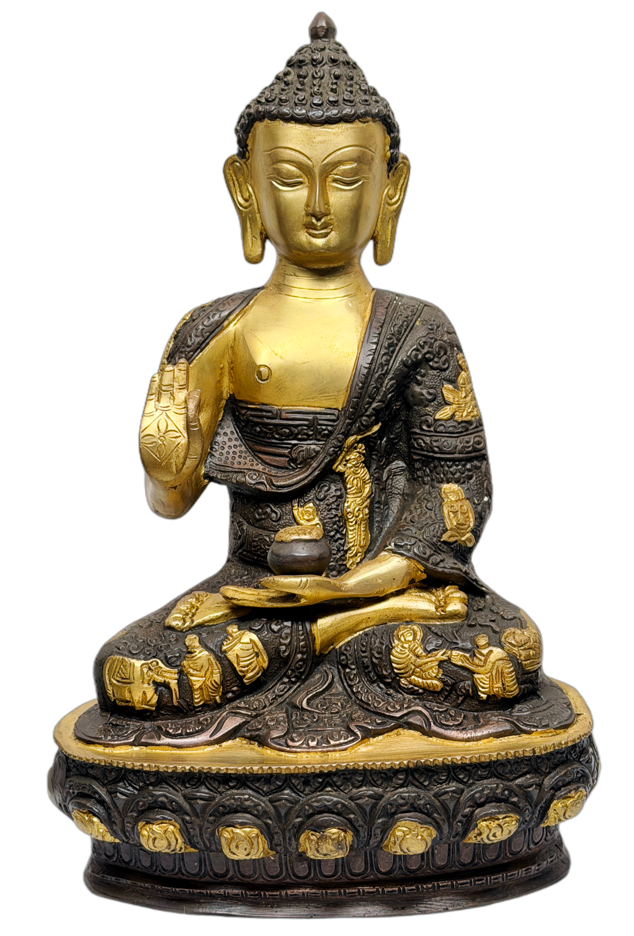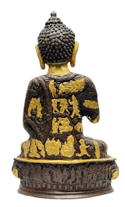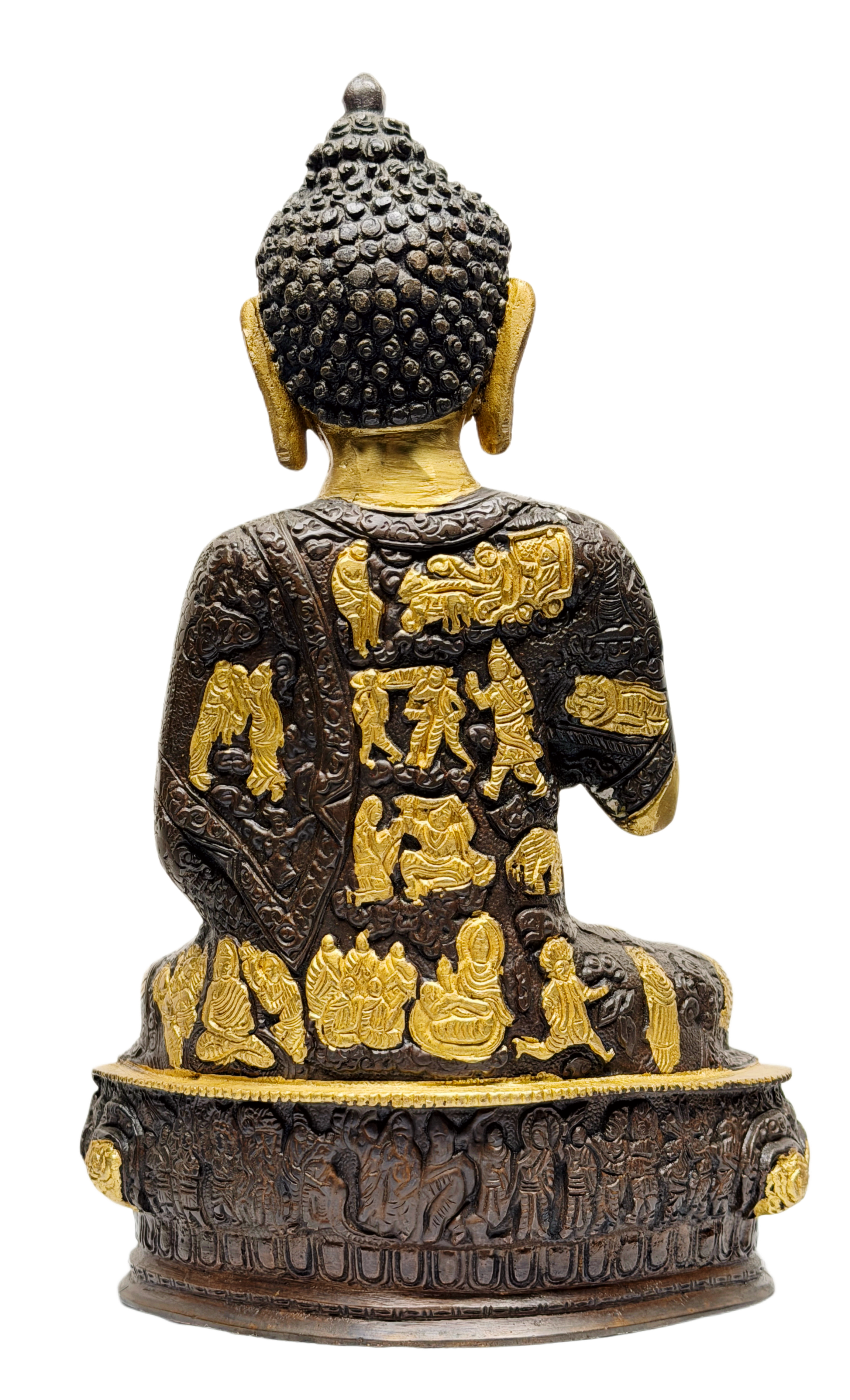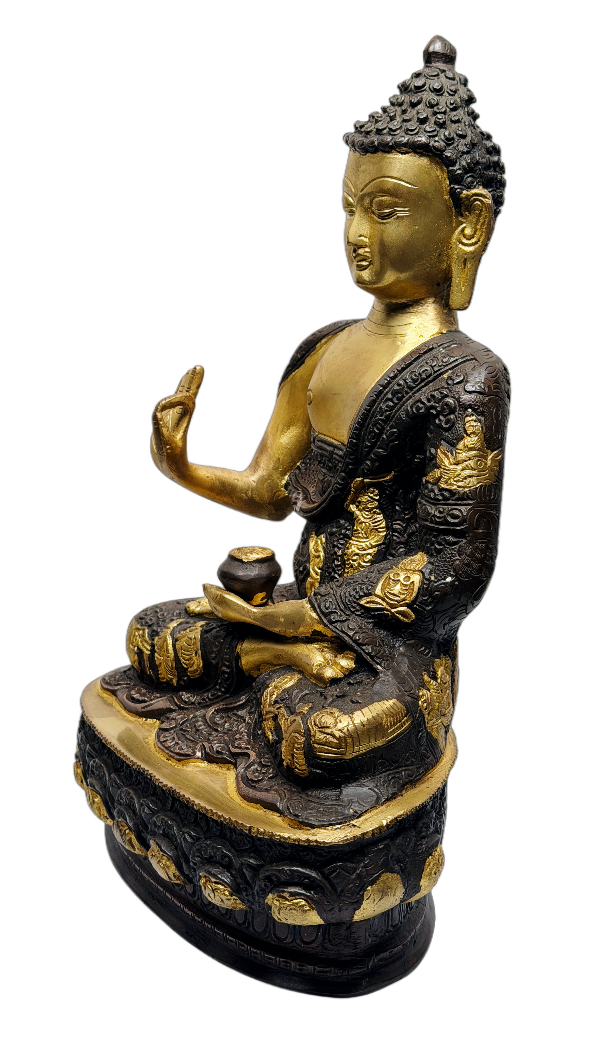 The statue is adorned with highly detailed embossed artwork, including miniature Buddha motifs, sacred figures and symbolic patterns across the robes and pedestal. The dual-tone finish in rich gold and antique bronze enhances its depth, elegance and spiritual presence, making it a striking centrepiece.