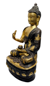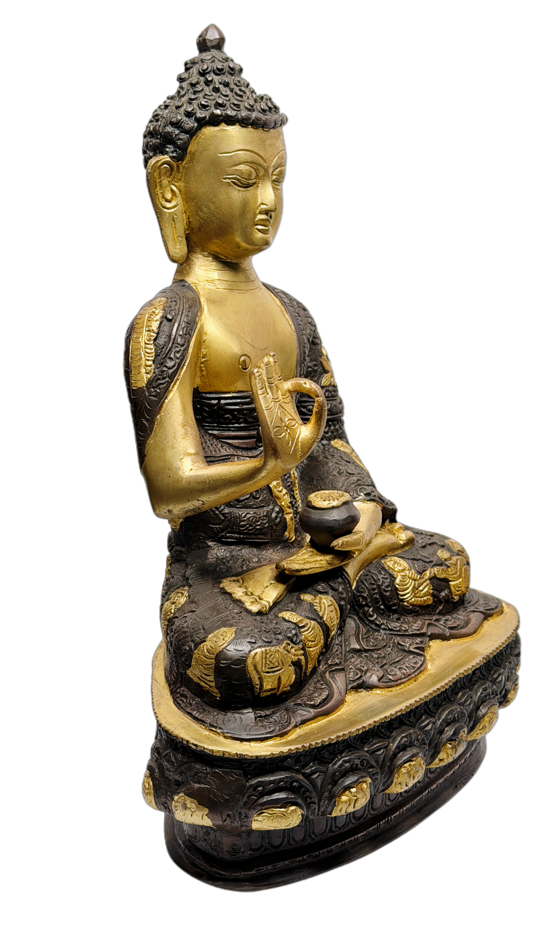 This beautifully crafted Meditation Buddha Idol features Lord Buddha seated in a serene lotus posture with the right hand raised in Abhaya Mudra, symbolising protection, peace and fearlessness. The left hand holds a symbolic offering bowl, representing healing, wisdom and inner nourishment.