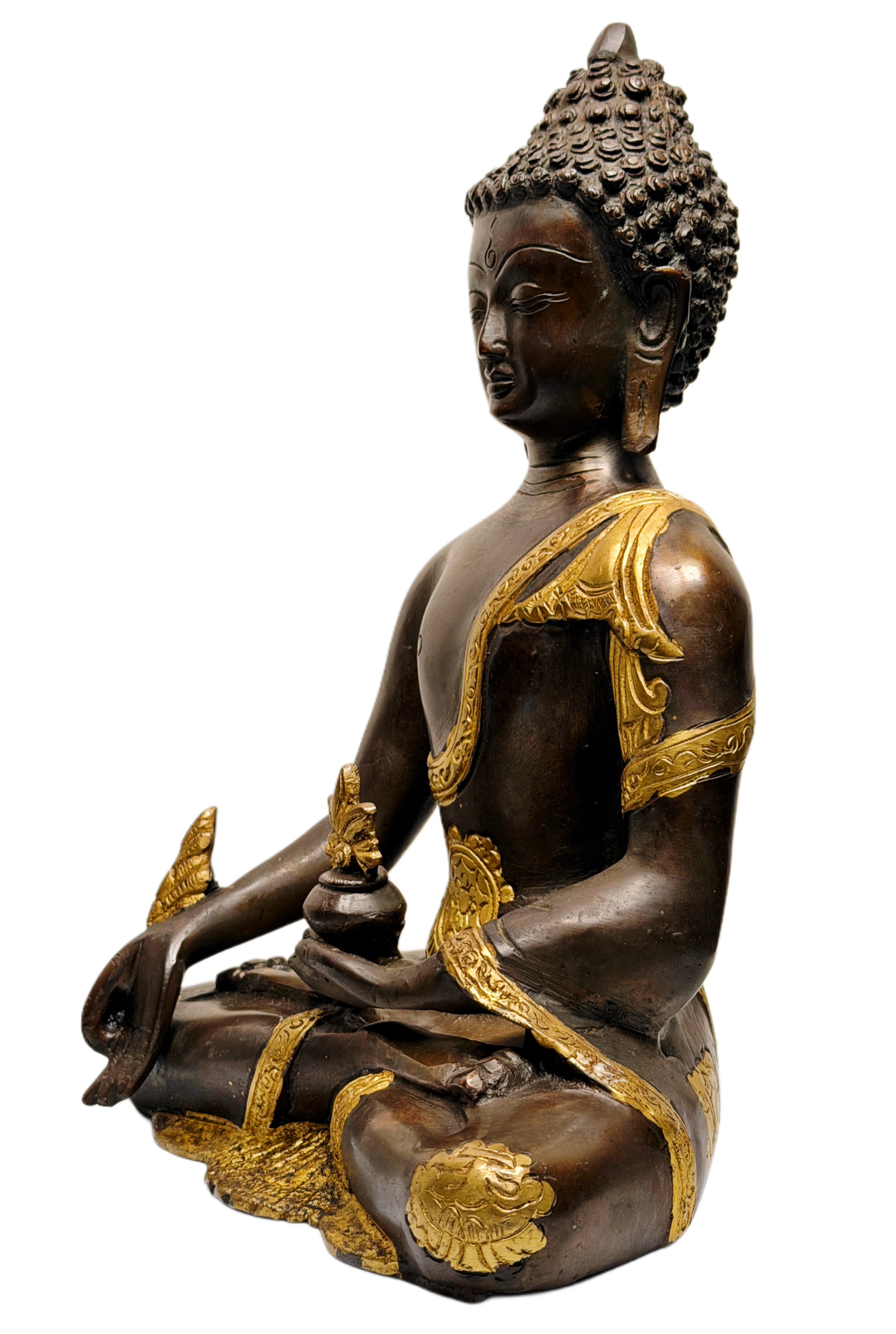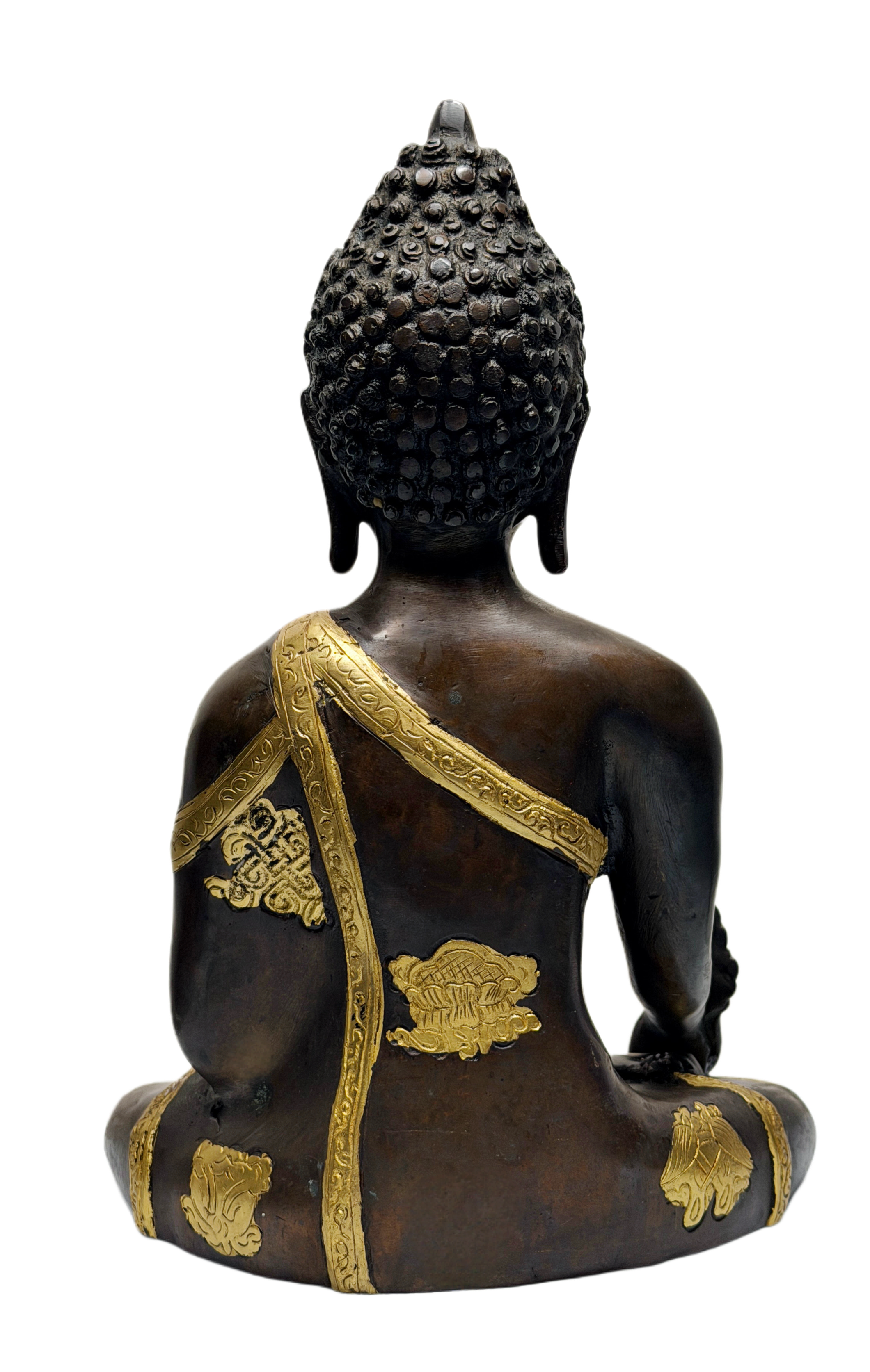 The statue is crafted with a deep antique bronze finish accented with refined gold detailing along the robe and symbolic motifs, giving it a traditional, serene and culturally rich appearance. With a smooth facial expression and minimalist ornamental styling, this Buddha Murti radiates tranquillity, mindfulness and balance.