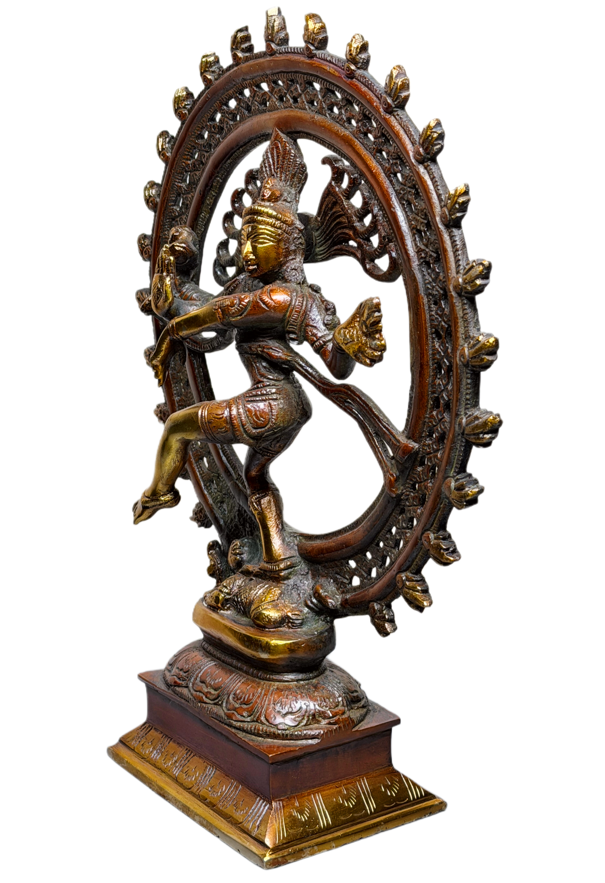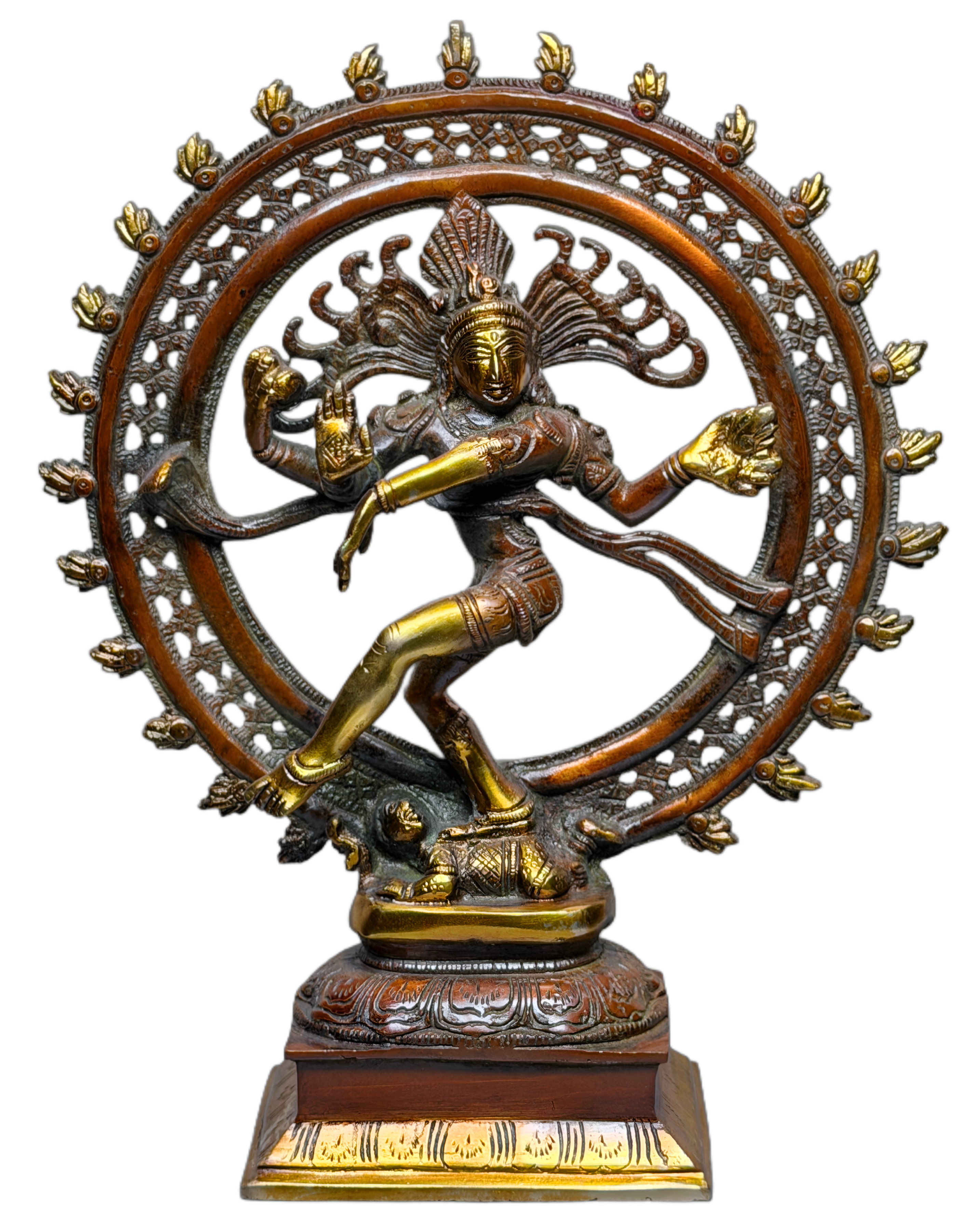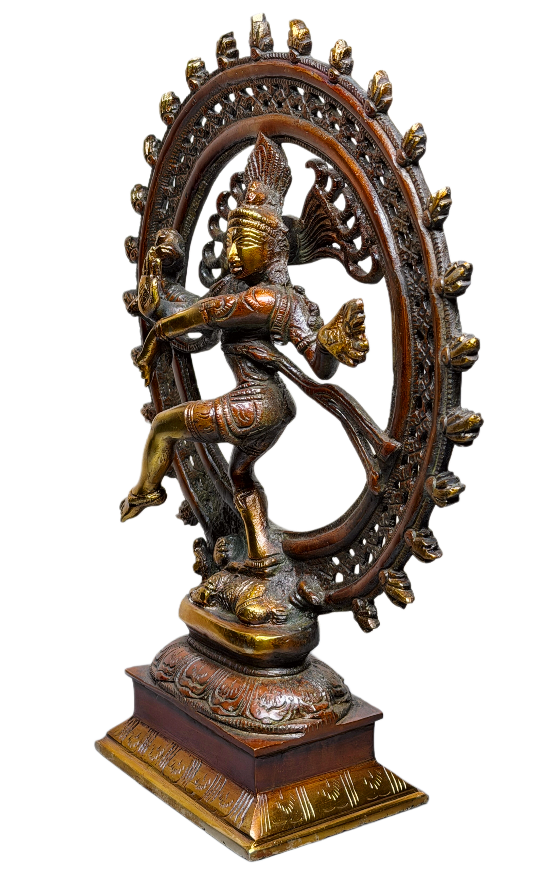 This beautifully crafted Lord Nataraja Idol depicts Shiva performing the cosmic dance of creation, preservation and destruction. Surrounded by an ornate circular flame halo, the statue symbolizes the eternal rhythm of the universe, inner transformation and spiritual awakening. The detailed craftsmanship highlights flowing movement, divine expression and symbolic elements including the raised hand of protection, damru, fire, and the dwarf of ignorance beneath.Finished in a rich antique gold and copper-brown tone, this Nataraj Murti is ideal for home décor, meditation spaces, classical dance studios, temples, offices and spiritual gifting. It enhances ambience with cultural elegance and powerful devotional energy.