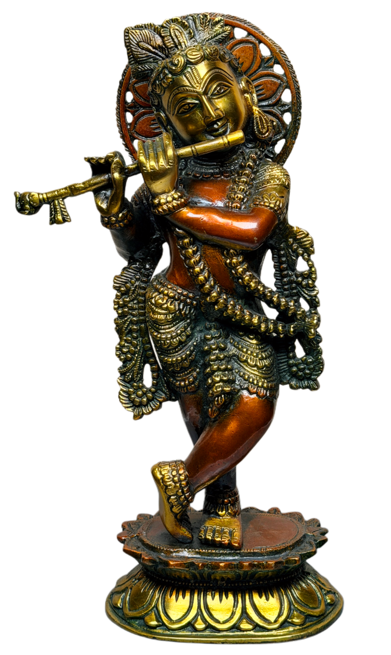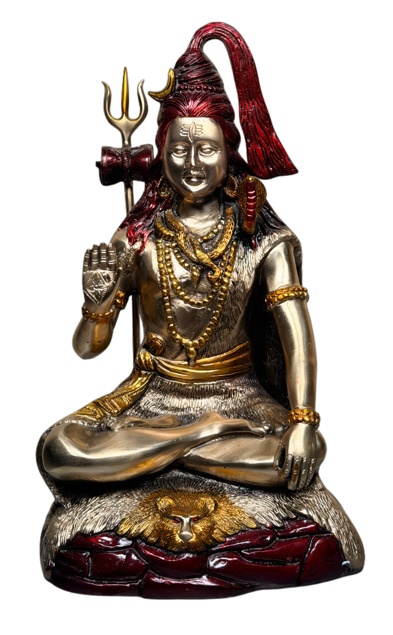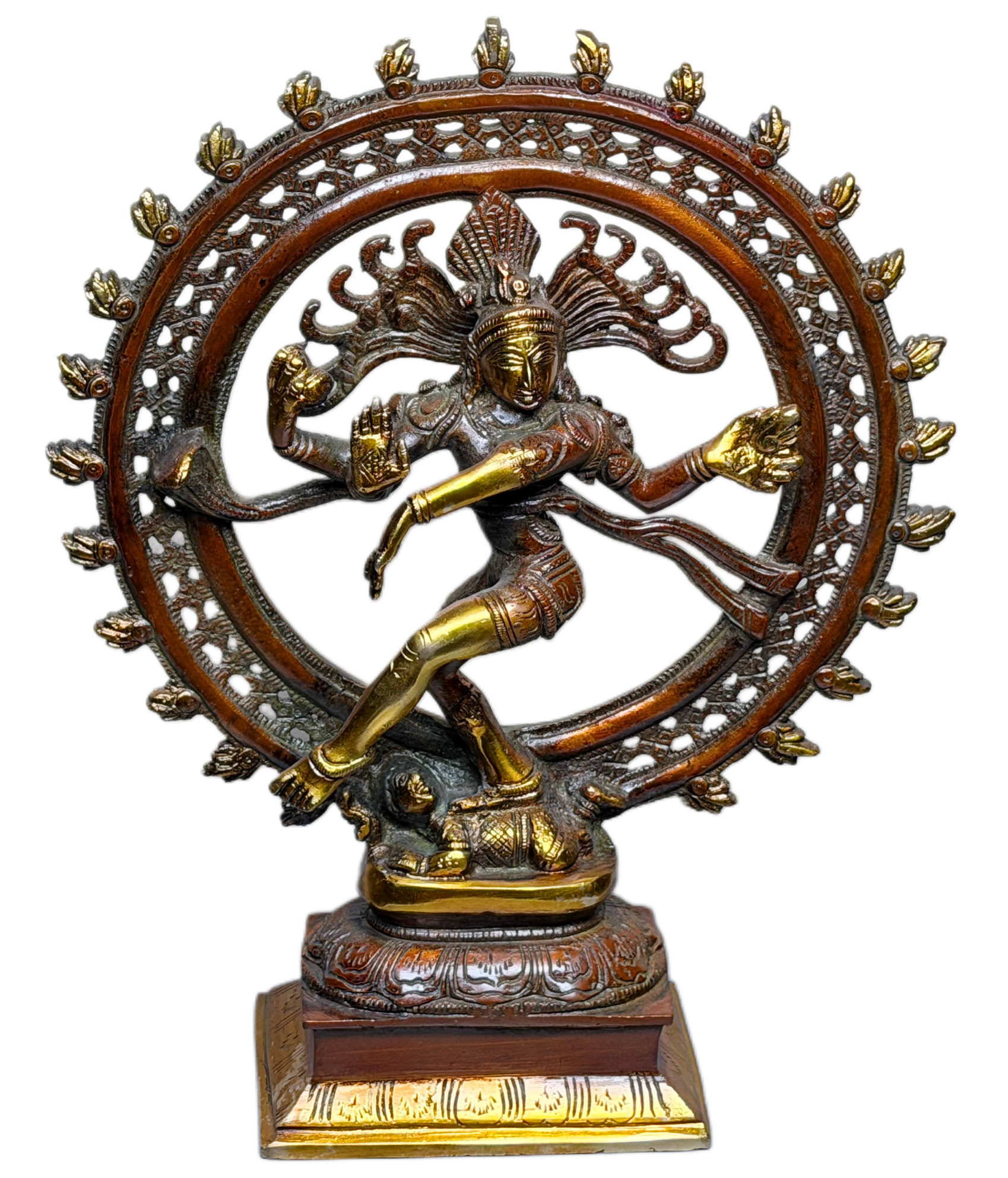 This beautifully crafted Lord Nataraja Idol depicts Shiva performing the cosmic dance of creation, preservation and destruction. Surrounded by an ornate circular flame halo, the statue symbolizes the eternal rhythm of the universe, inner transformation and spiritual awakening. The detailed craftsmanship highlights flowing movement, divine expression and symbolic elements including the raised hand of protection, damru, fire, and the dwarf of ignorance beneath.Finished in a rich antique gold and copper-brown tone, this Nataraj Murti is ideal for home décor, meditation spaces, classical dance studios, temples, offices and spiritual gifting. It enhances ambience with cultural elegance and powerful devotional energy.