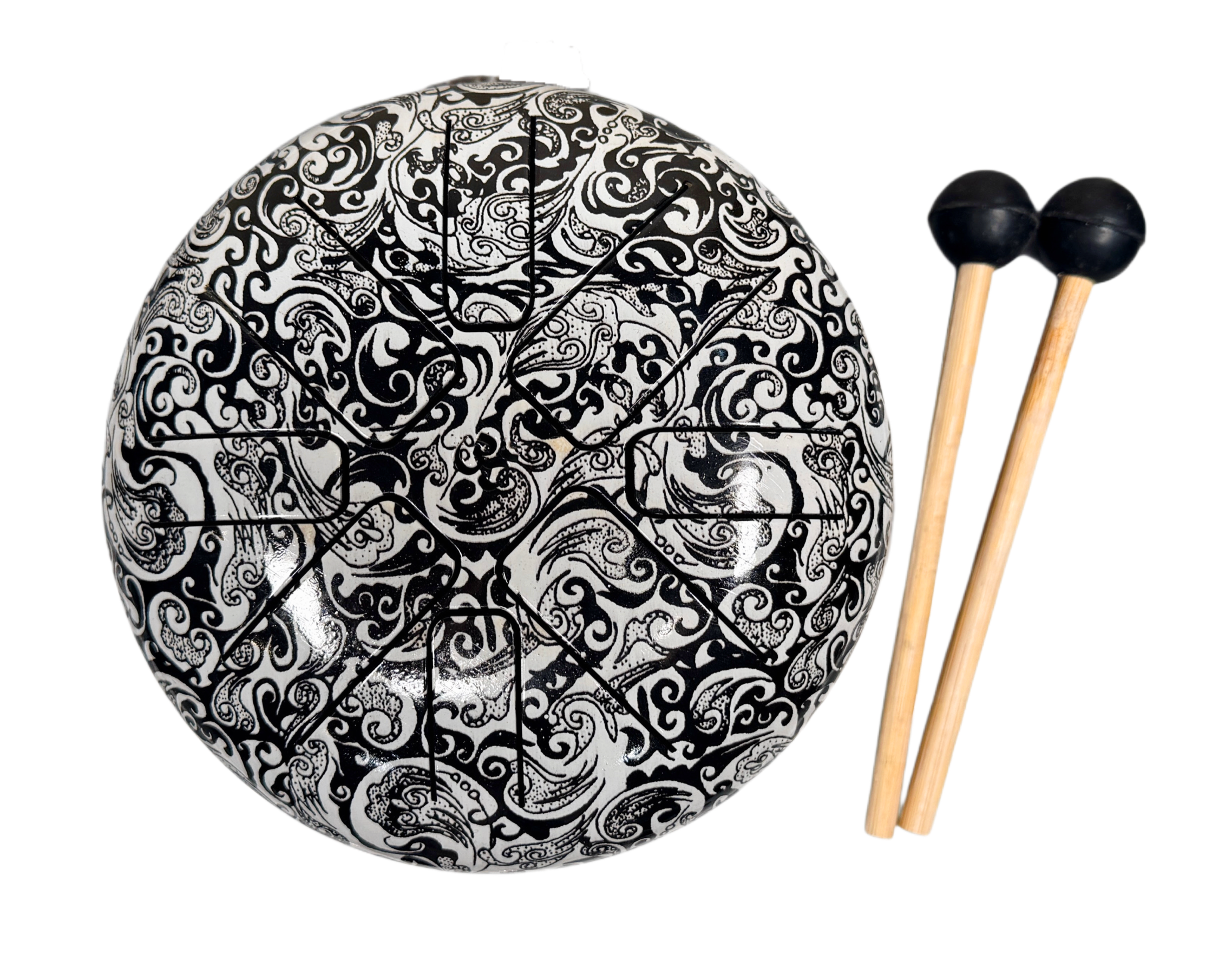 Experience soothing melodies and vibrant energy with our Hand-Painted HAPI Steel Tongue Drum, crafted for meditation, music therapy, yoga, classroom use, and personal relaxation.Each drum is beautifully decorated with an intricate multicolor artisan design, making it not just a musical instrument but also a unique decorative art piece.This compact 7-inch drum produces clear, warm, melodic tones with a calming vibration, perfect for beginners as well as professional sound healers.