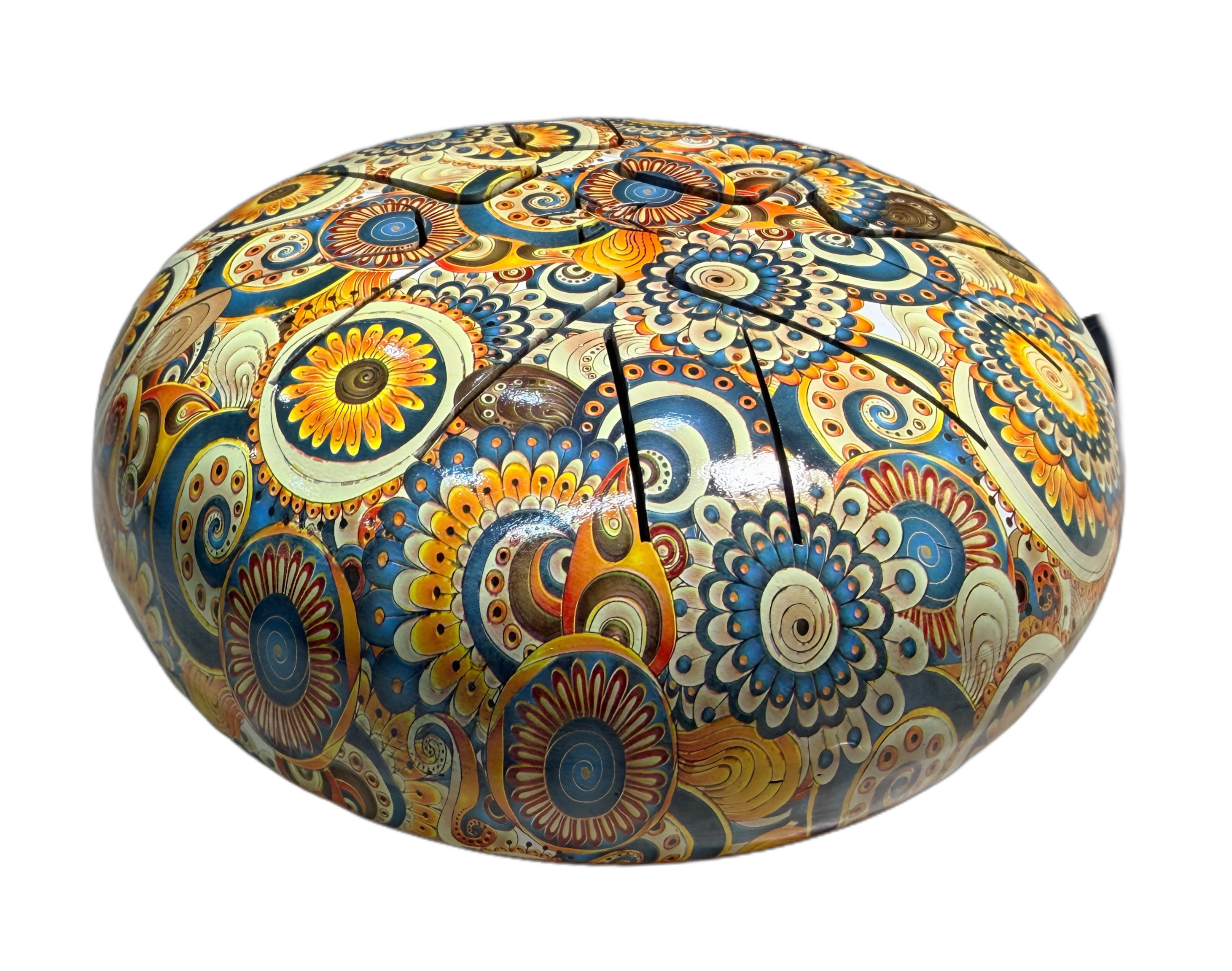 Experience soothing melodies and vibrant energy with our Hand-Painted HAPI Steel Tongue Drum, crafted for meditation, music therapy, yoga, classroom use, and personal relaxation.Each drum is beautifully decorated with an intricate multicolor artisan design, making it not just a musical instrument but also a unique decorative art piece.This compact 7-inch drum produces clear, warm, melodic tones with a calming vibration, perfect for beginners as well as professional sound healers.