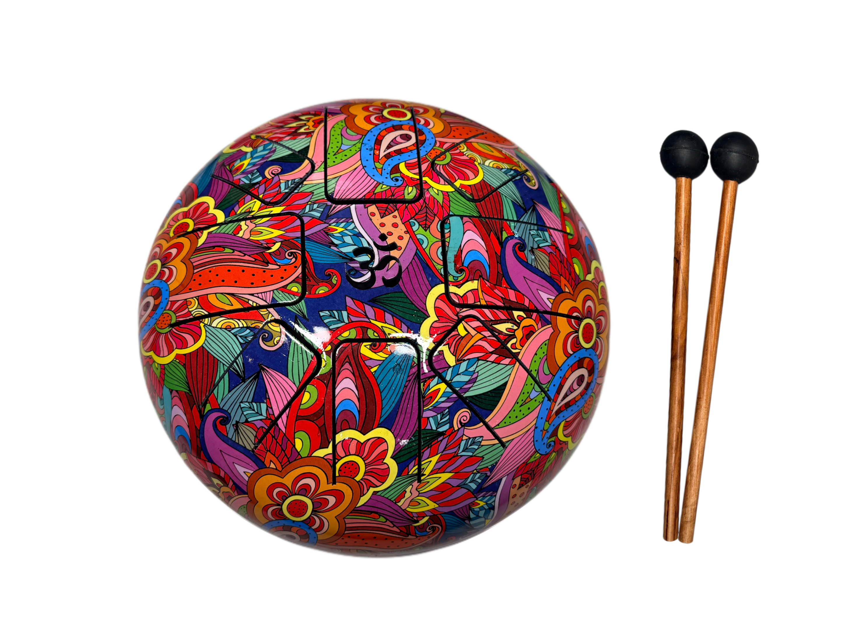 Experience soothing melodies and vibrant energy with our Hand-Painted HAPI Steel Tongue Drum, crafted for meditation, music therapy, yoga, classroom use, and personal relaxation.Each drum is beautifully decorated with an intricate multicolor artisan design, making it not just a musical instrument but also a unique decorative art piece.This compact 7-inch drum produces clear, warm, melodic tones with a calming vibration, perfect for beginners as well as professional sound healers.