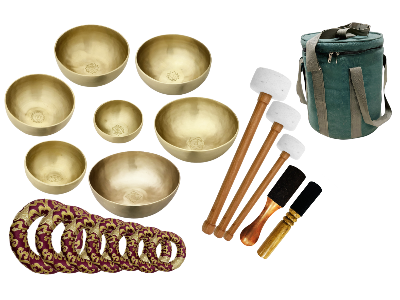 7 Hand-Hammered Tibetan Singing Bowls, each dedicated to one chakra