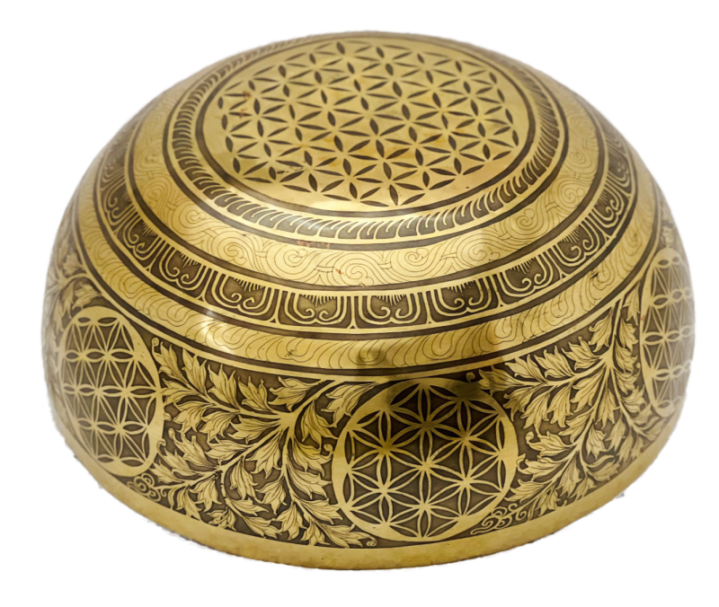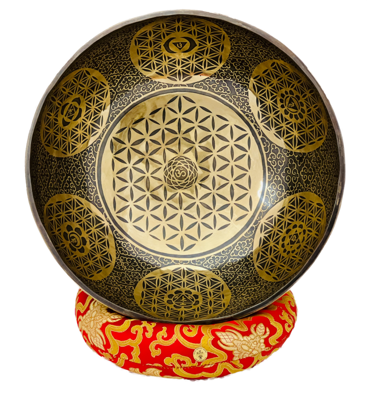 Flowe Of Life Singing Bowls are used for deep meditation and protection from various painful and common diseases.The resonance of the sweet musical tunes smoothen the environment, calms the mind and bring relief to the whole body.They are used to help treat cancer patients and also for post-traumatic stress disorder.use mallets to strike or circle the bowls in a particular sequence, creating sound and vibrations. Engraving Singing Bowl Design Made by Professional Desiginer Only , Hand Made Design Only