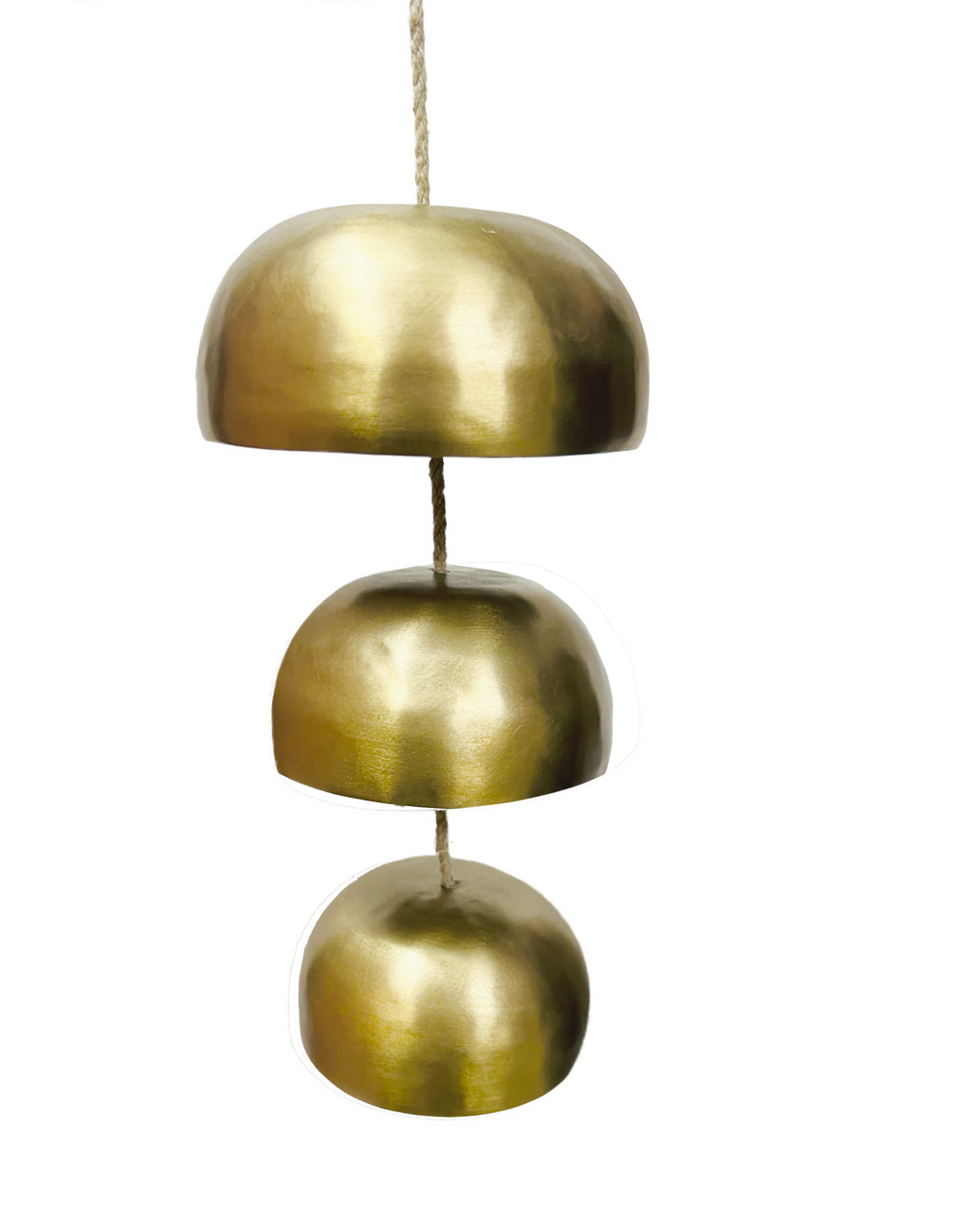 The Harmony Hanging Singing Bowl is a unique and beautifully crafted sound instrument designed for meditation, relaxation, and energy healing. This piece features three golden, dome-shaped metal bowls suspended vertically by a rope, creating a visually stunning and harmonious aesthetic.