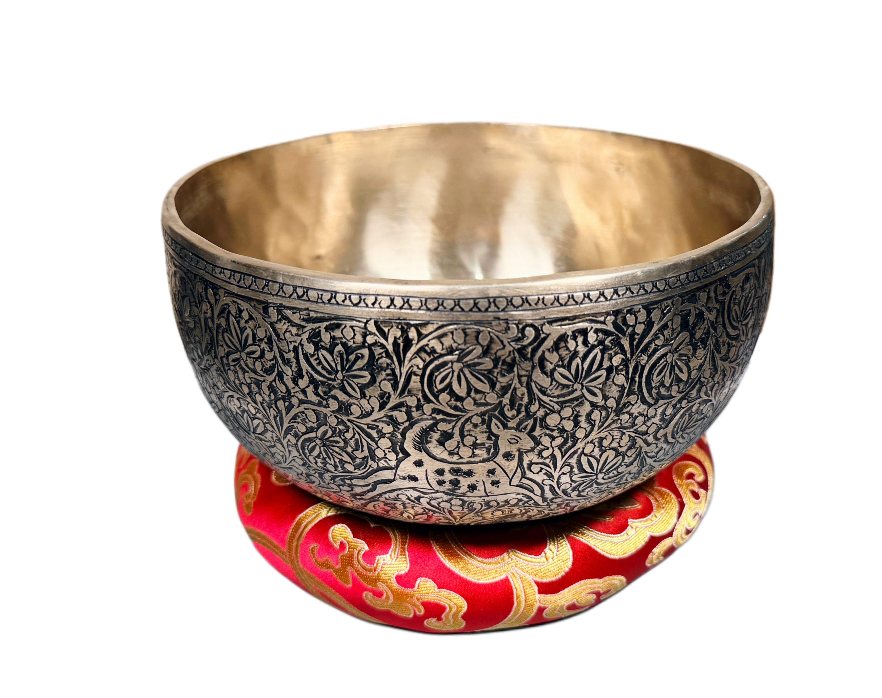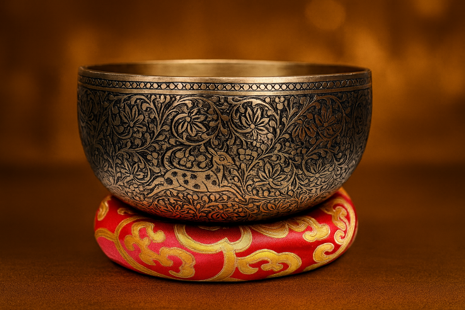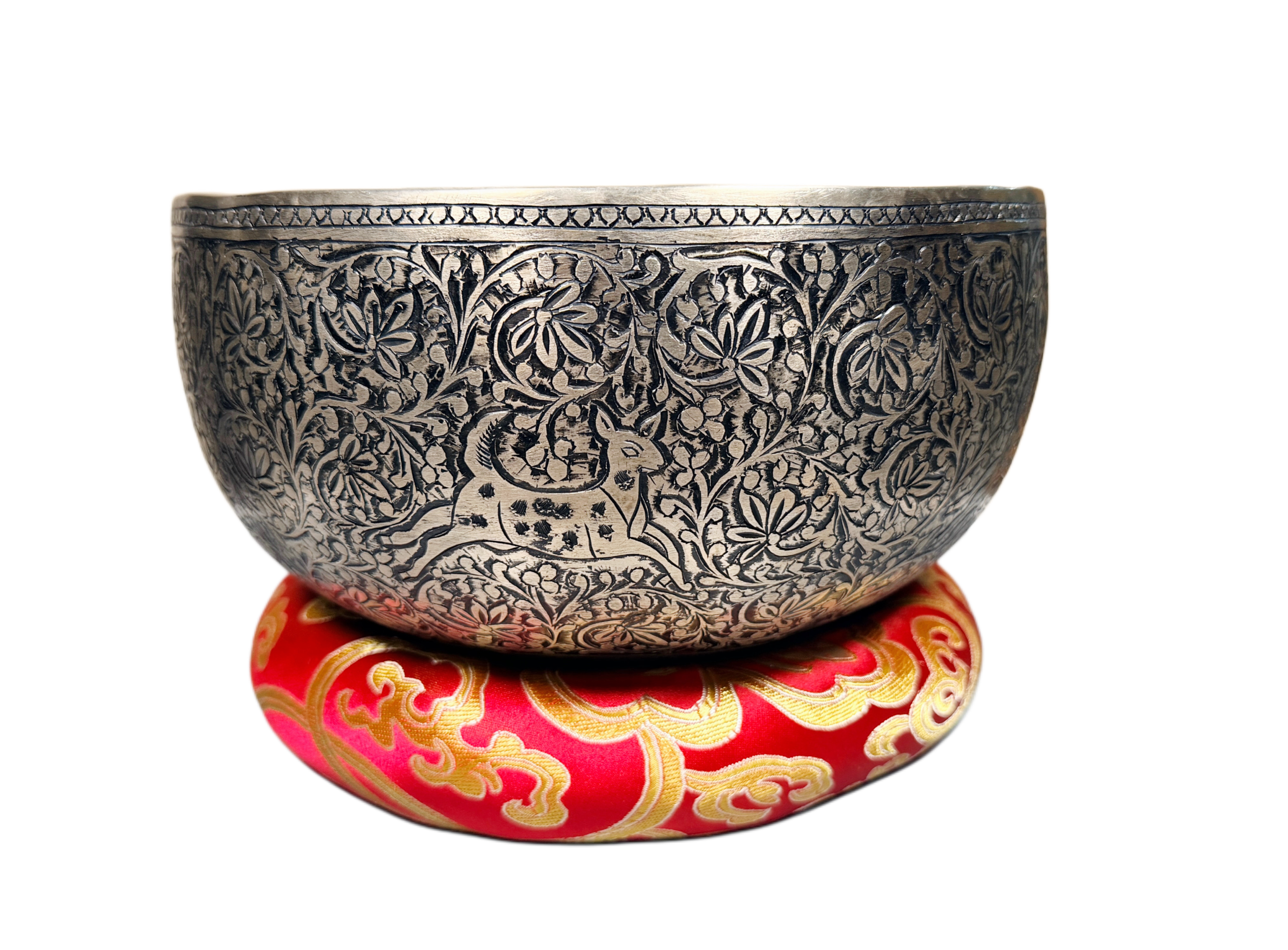 Experience exquisite Himalayan craftsmanship with our Luxury Hand-Carved Deer Singing Bowl, featuring a detailed forest engraving with a beautifully carved running deer motif.