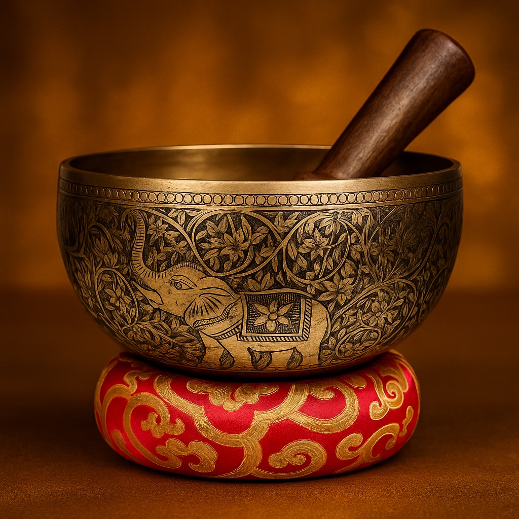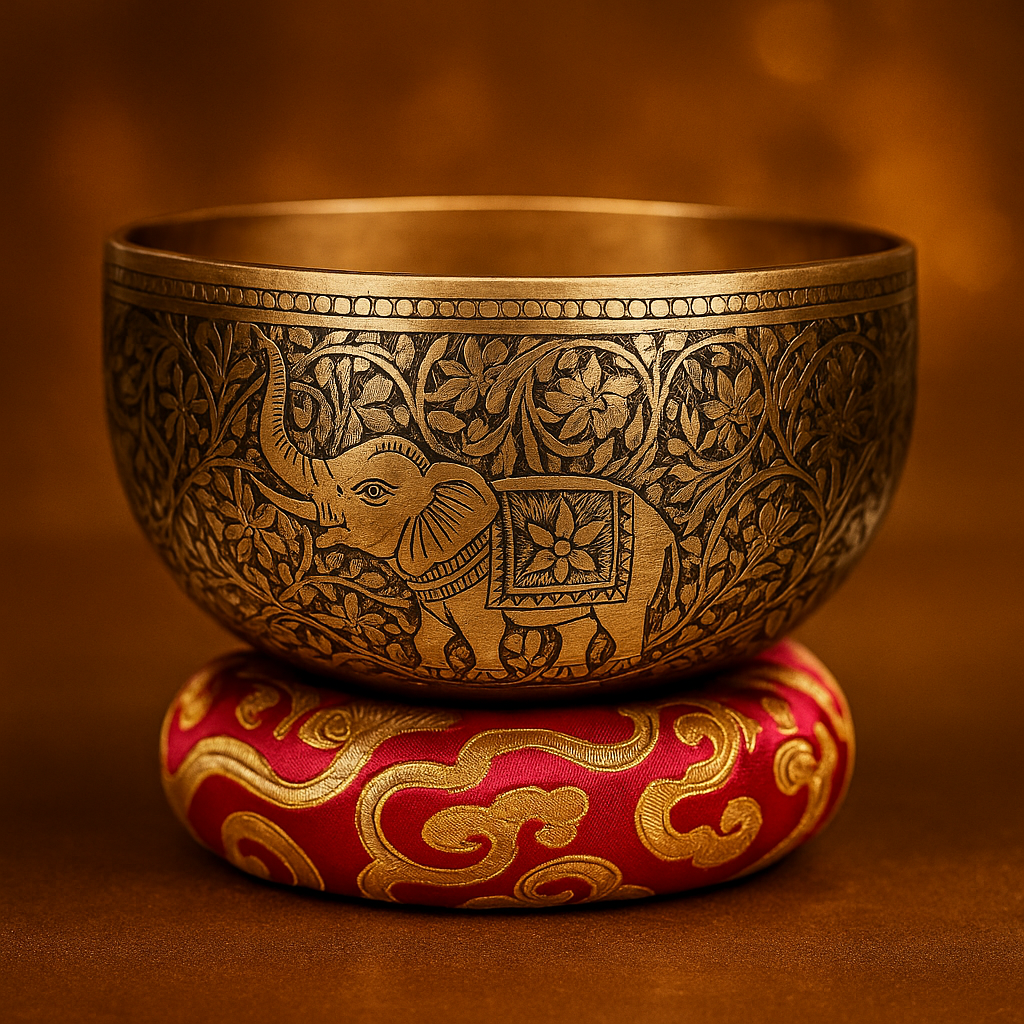 Experience the beauty of traditional Himalayan craftsmanship with our Luxury Hand-Carved Elephant Singing Bowl, a stunning piece featuring a fully engraved elephant motif symbolizing wisdom, strength, protection, and good fortune.