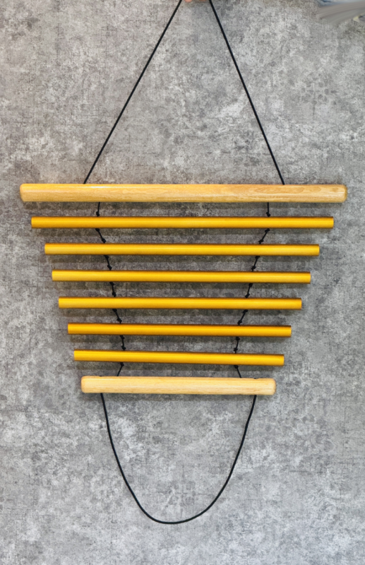 A 6-bar swinging chime is a percussion instrument consisting of nine metal, wooden, bars suspended from a frame. These bars are designed to swing freely, producing resonant and melodic tones when struck or moved by air currents.