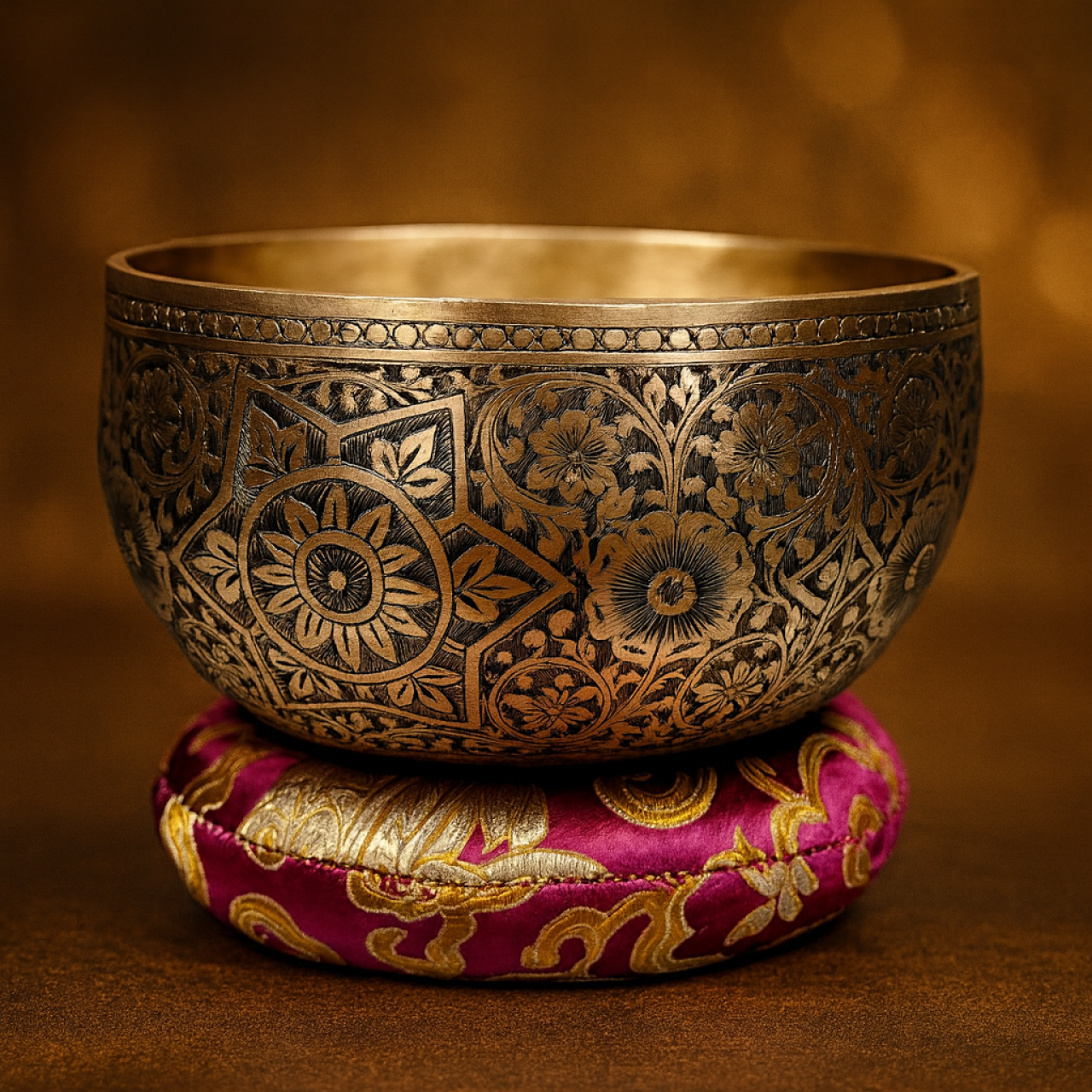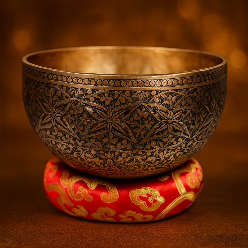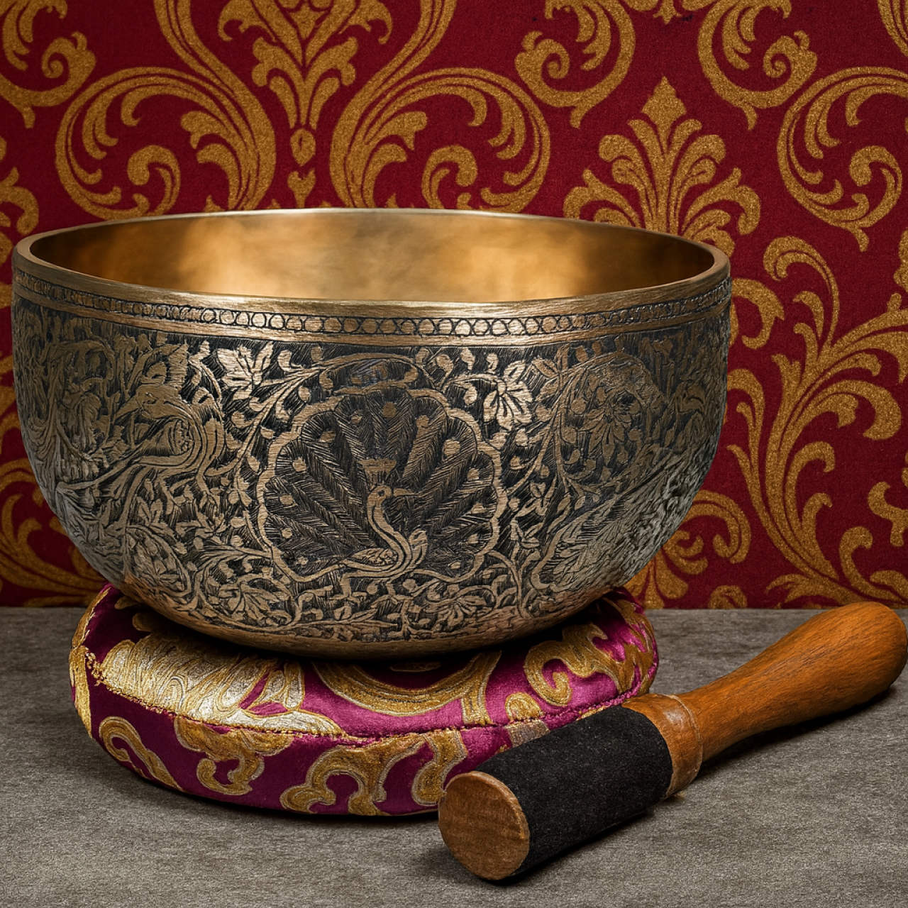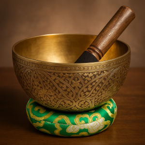 A singing bowl is a type of bell that produces a rich, harmonic sound when struck or rubbed with a mallet. Traditionally used in Tibetan Buddhist practices, these bowls are often associated with meditation, relaxation, and sound healing.When you gently strike or rub the rim of the bowl with a wooden or suede mallet, the bowl vibrates, creating a sustained, resonant sound.The vibrations can produce deep relaxation and a meditative state.